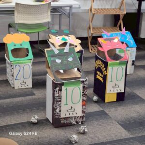 新聞紙で作ったボールを入れるゲームとなっております🎶